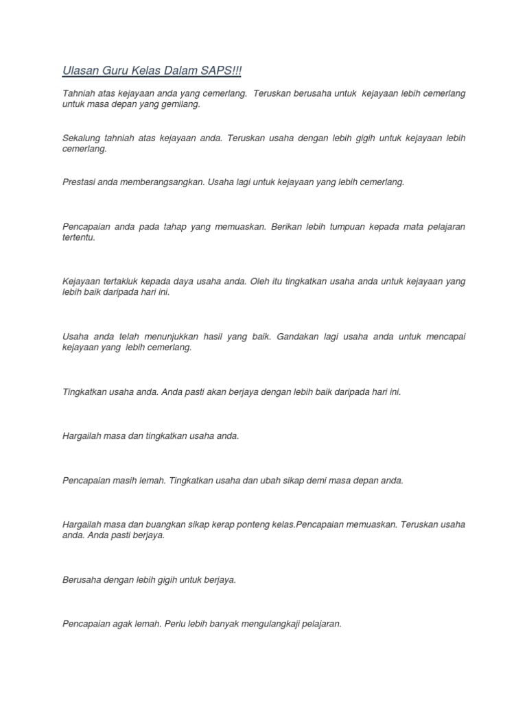 Takde dah buku keputusan peperiksaan macam dulu. Kat bawah ni mf kongsikan beberapa ulasan guru kelas untuk diisi dalam saps. Contoh ulasan guru kelas dalam saps kahanan.
